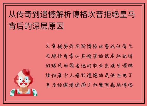 文章摘要:丹尼斯·博格坎普,这位荷兰足球传奇,素以其精湛的技术和独特的球风而闻名。他的职业生涯可谓辉煌,但最令人感到遗憾的是,他拒绝了皇马的邀请,选择了加盟阿森纳。博格坎普的这一决定一直成为足坛广为议...